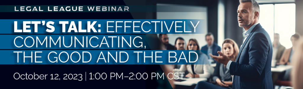 In order to alleviate that communication gap, Legal League is presenting a webinar titled, “Let’s Talk: Effectively Communicating—The Good and the Bad,” set for Thursday, October 12, from 1:00 p.m.-2:00 p.m. Central.