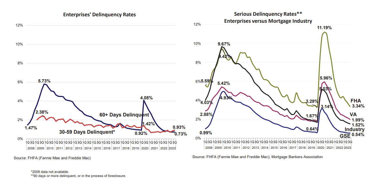- The GSEs’ serious (90 days or more) delinquency rate fell slightly to 0.54% at the end of Q3. This compared with 3.34% for Federal Housing Administration (FHA) loans, 1.99% for Veterans Affairs (VA) loans, and 1.52% for all loans (industry average).