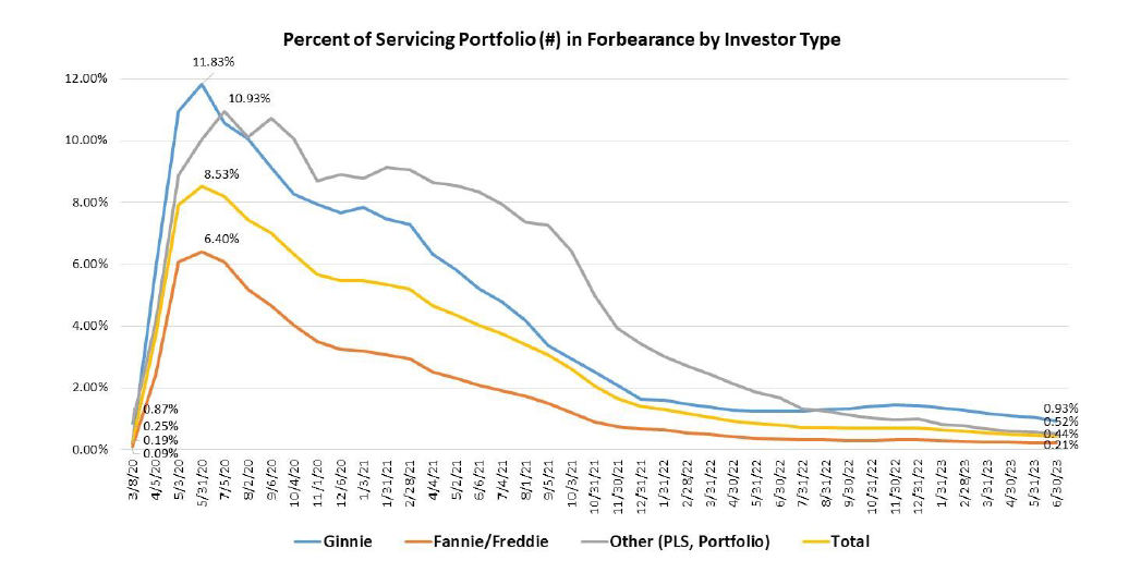 In June 2023, the share of Fannie Mae and Freddie Mac (GSE) loans in forbearance decreased two basis points from 0.23% to 0.21%. Ginnie Mae loans in forbearance decreased 13 basis points from 1.06% to 0.93%, and the forbearance share for portfolio loans and private-label securities (PLS) decreased six basis points from 0.58% to 0.52%.