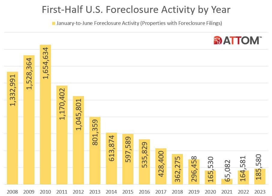 According to ATTOM’s Midyear 2023 U.S. Foreclosure Market Report, there were a total of 185,580 U.S. properties with foreclosure filings—default notices, scheduled auctions or bank repossessions—in the first six months of 2023, up 13% year-over-year and up 185% from the same time period two years ago during the heart of the pandemic.