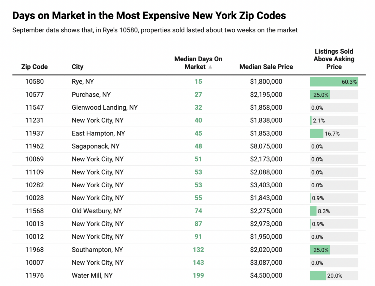 From Brooklyn to the Hamptons, listings sold in wealthy New York ZIP codes lasted anywhere from about two weeks to almost 200 days on the market, according to the latest September data. That was the case of the ultra-exclusive celeb spot of Water Mill's 11976 (median sale price $4,500,000). Likewise, homes sold in 11968 in Southampton and 10007 in New York City stayed on the market way past 100 days, whereas homes in 10580 in Rye were purchased in just 15 days (60% of them for more than the initial asking price).