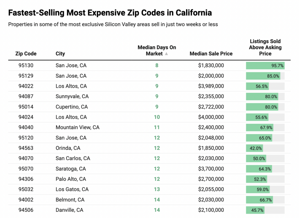 - Bidding wars are here to stay in most of the priciest enclaves. In 23 of the country’s most expensive ZIP codes, more than half of the properties were sold above asking price; in San Jose, CA, most of the homes sold in 95130 (96%) and 95129 (85%) went above asking price.