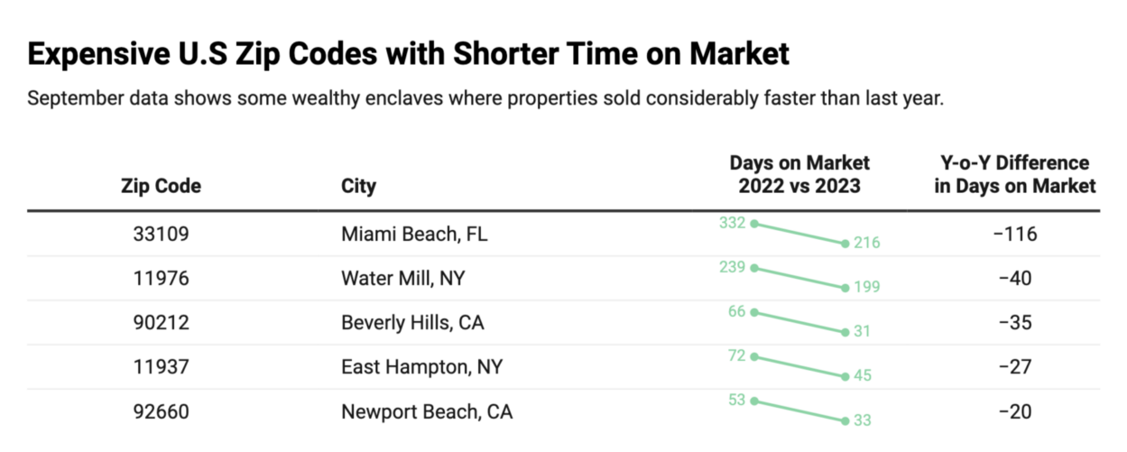 - Compared to last year, properties sold faster in half of the country’s most expensive ZIP codes. In 33109 of Miami Beach, FL, September data shows homes purchased 116 days quicker than the same time in 2022.