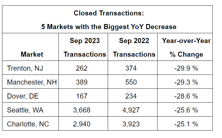 - Closed transactions (the total number of closed residential transactions during the given month): Of the 50 metro areas surveyed in September 2023, the overall number of home sales is down 13.8% compared to August 2023, and down 17% compared to September 2022. The markets with the biggest decrease in year-over-year sales percentage were Trenton, New Jersey at -29.9%; Manchester, New Hampshire at -29.3%; and Dover, Delaware at -28.6%. Only one market had an increase in year-over-year sales percentage, Tampa, Florida at +11.7%.