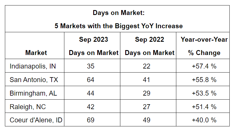 - Days on the market (average of 50 metro areas): The average days on market for homes sold in September 2023 was 35, up one day compared to the average in both August 2023 and September 2022. The metro areas with the lowest days on market were Baltimore at 12, followed by a tie between Dover, Delaware; and Trenton, New Jersey at 13. The highest days on market averages were reported in Fayetteville, Arkansas at 71; Coeur d'Alene, Idaho at 69; and San Antonio, Texas at 64. Days on market is the number of days between when a home is first listed in an MLS and a sales contract is signed.