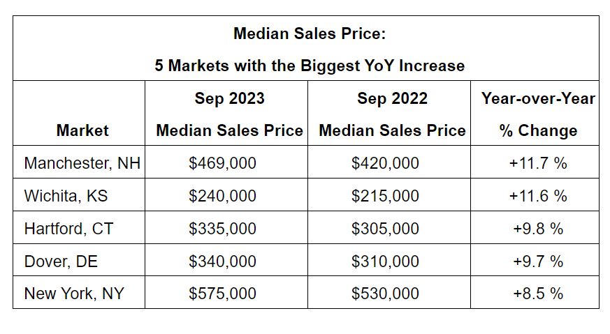 - Median sales price (median of 50 metro area prices): In September 2023, the median of all 50 metro area sales prices was $415,000, down 2.4% compared to August 2023, and up 2.5% from September 2022. The markets with the biggest year-over-year increase in median sales price were Manchester, New Hampshire at +11.7%; Wichita, Kansas at +11.6%; and Hartford, Connecticut at +9.8%. The markets with the biggest year-over-year decrease in median sales price were found in Houston at -2.5%; followed by a tie between Las Vegas and Phoenix, both at -1.9%.