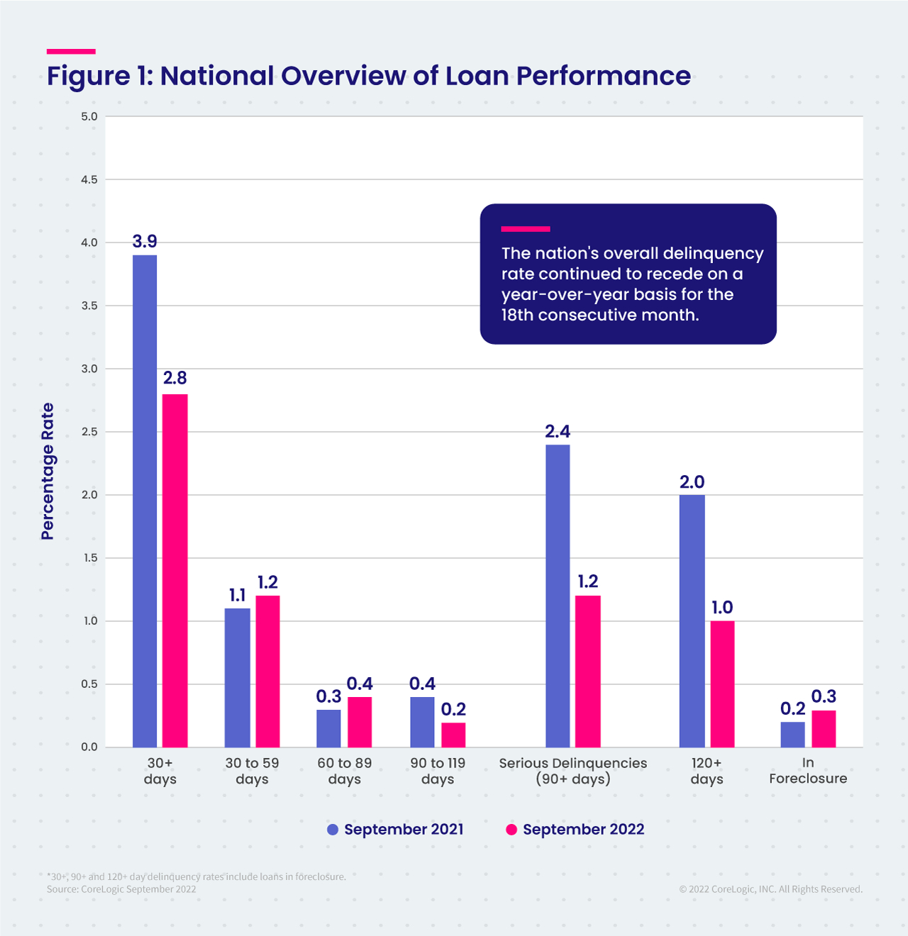 CoreLogic’s Loan Performance Insights Report for September 2022 has found that 2.8% of all mortgages nationwide (approximately 1.4 million loans) were in some stage of delinquency (30 days or more past due, including those in foreclosure), representing a 1.1 percentage point decrease compared to 3.9% in September 2021. The nation’s overall delinquency rate dropped for the 18th straight month on an annual basis.