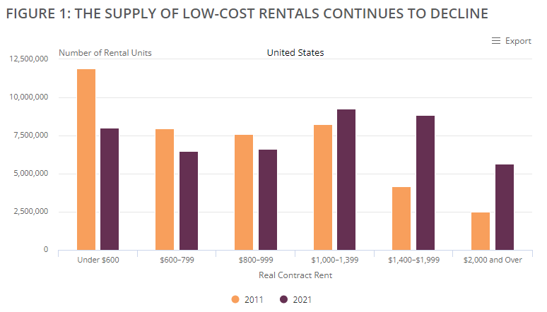 The supply of low-rent units has fallen continuously in the past decade due to rent increases in existing units, tenure conversions out of the rental stock, building condemnations, and demolitions. Adjusting for inflation, the number of units with contract rents below $600 fell from 11.9 million to 8.0 million between 2011 and 2021.