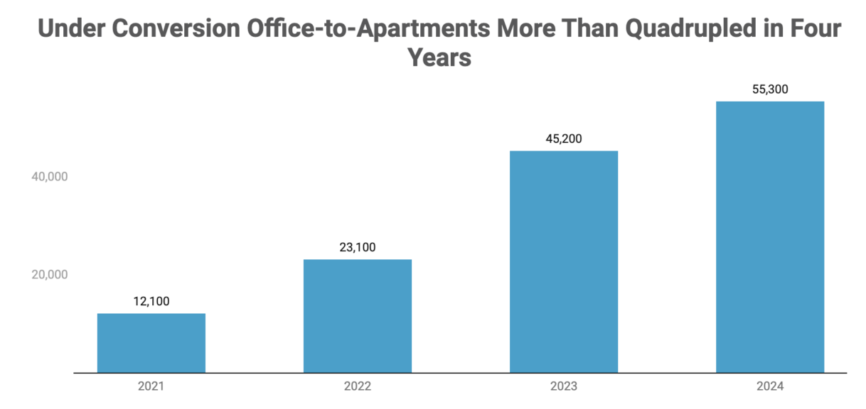 According to a new RentCafe report, over the past four years, there has been extraordinary growth in the conversion of office buildings into living spaces, with an estimated 12,100 apartments crafted out of old office spaces in 2021. By 2022, that number had nearly doubled to 23,100.