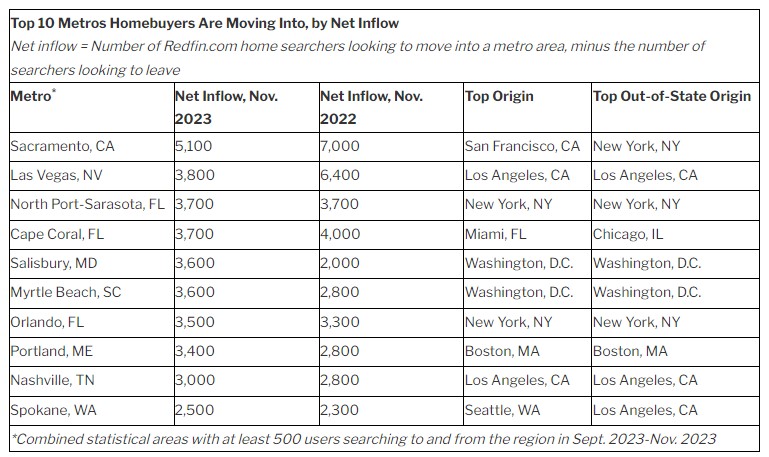 Overall, homebuying in 2023 was rough for most people due to the fact that affordability was at an all-time low due to severe lack in inventory. There were 4% fewer Redfin.com users looking to move to a new metro in November than a year ago, compared with a 3% year-over-year drop for Redfin.com users searching within their home metro. The slightly bigger drop for house hunters looking to relocate explains why migrants are making up a smaller share of overall home searchers.