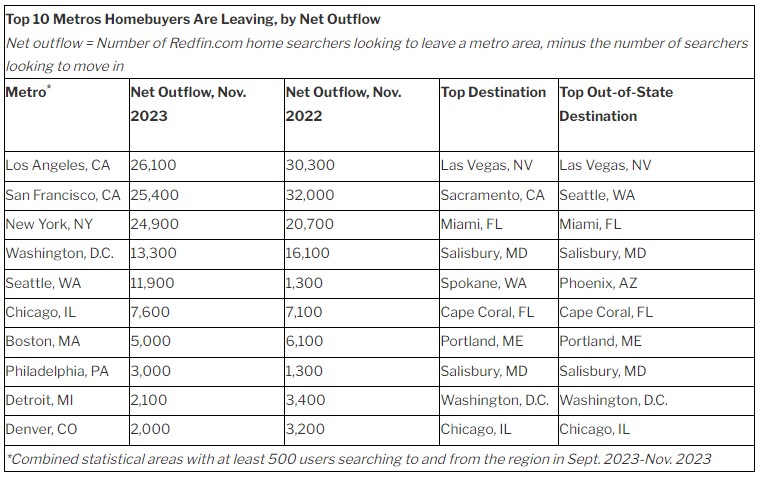 For outflow, more homebuyers are leaving Los Angeles than any other metro area in the country. This marks the first time on record it has been the number-one place homebuyers are leaving and the first time in over two years the Bay Area has dropped out of the number-one spot. The Bay Area comes in second, followed by New York. That’s based on net outflow, a measure of how many more Redfin.com users are looking to leave a metro than move in.