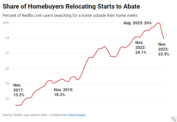 According to a year-end report from Redfin, the share of U.S. homebuyers looking to move to a different metro area in November declined for the third straight month, dropping to 23.9% of all movers from a sample size of about 2 million Redfin users.