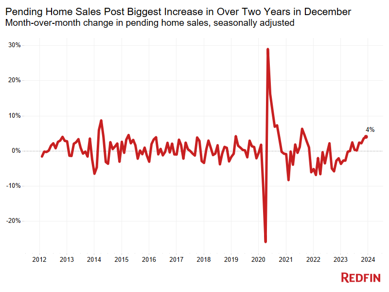 Homebuyers are beginning to come out of the woodwork due to the largest drop in mortgage rates since 2008 pushing pending home sales up 4.1% month-over-month on a seasonally adjusted basis in December—the highest level in more than a year.