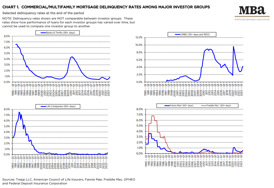 “Not unexpectedly, delinquency rates on commercial mortgages increased for the third consecutive quarter,” said Jamie Woodwell, MBA’s Head of Commercial Real Estate Research. “Every major capital source saw delinquency rates rise, driven by higher interest rates, changes in some property market fundamentals, and uncertainty about property values. CRE market activity remains muted, further complicating the situation.”