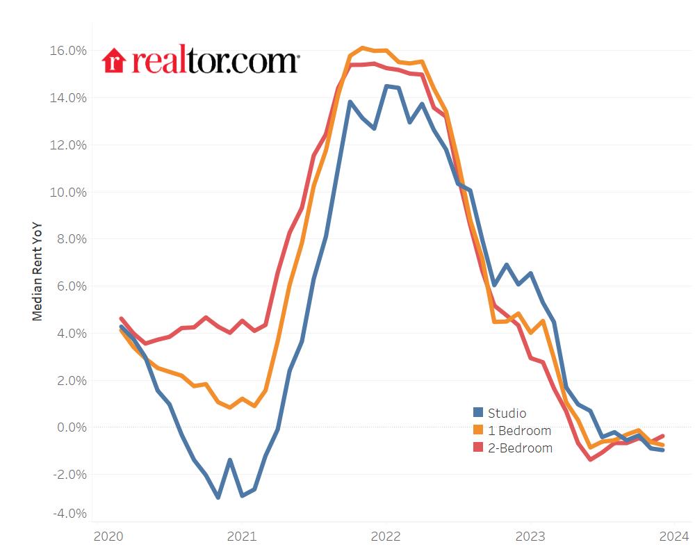 According to a new article by Realtor.com—authored by Jiayi Xu and Chief Economist Danielle Hale—in December 2023, the U.S. median rent continued to see a year-over-year decline, now down 0.4% for 0-2 bedroom apartments across the top 50 metropolitan areas in the country.