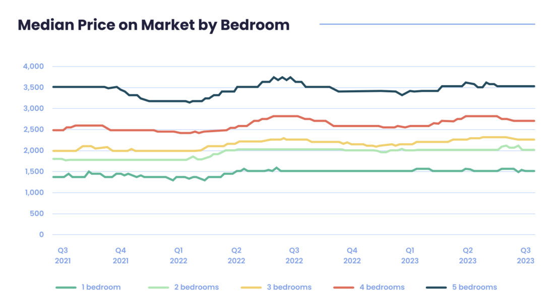 In Q3 2023, rental properties stayed on the market for an average of 27.1 days, a 28.4% increase since the same period in 2022 and an 11.1% increase since Q2 2023. Due to the increasing supply, the median price for the last week of Q3 2023 was unchanged as compared to the same week a year ago. Besides 4-bedroom and 5-bedroom units, all other rentals saw slight year-over-year increases in price, with the highest increase being 3-bedroom units, which saw a 1.88% year-over-year increase.