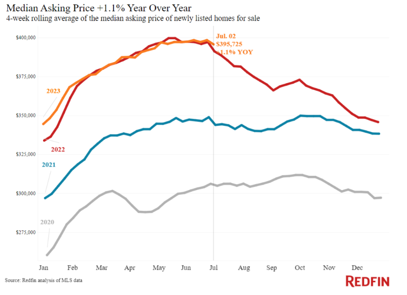 - The median asking price of newly listed homes was $395,725, up 1.1% from a year earlier. Asking prices have been increasing for a month.