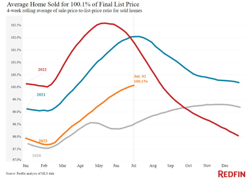 A new study from Redfin has found that the average sale-to-list price ratio hit 100.1% during the four weeks ending July 2, marking the first time in nearly a year the average U.S. home is selling for more than its asking price. Additionally, the median home-sale price was down just $1,000 (-0.3%) from a year ago, when prices were near record highs.